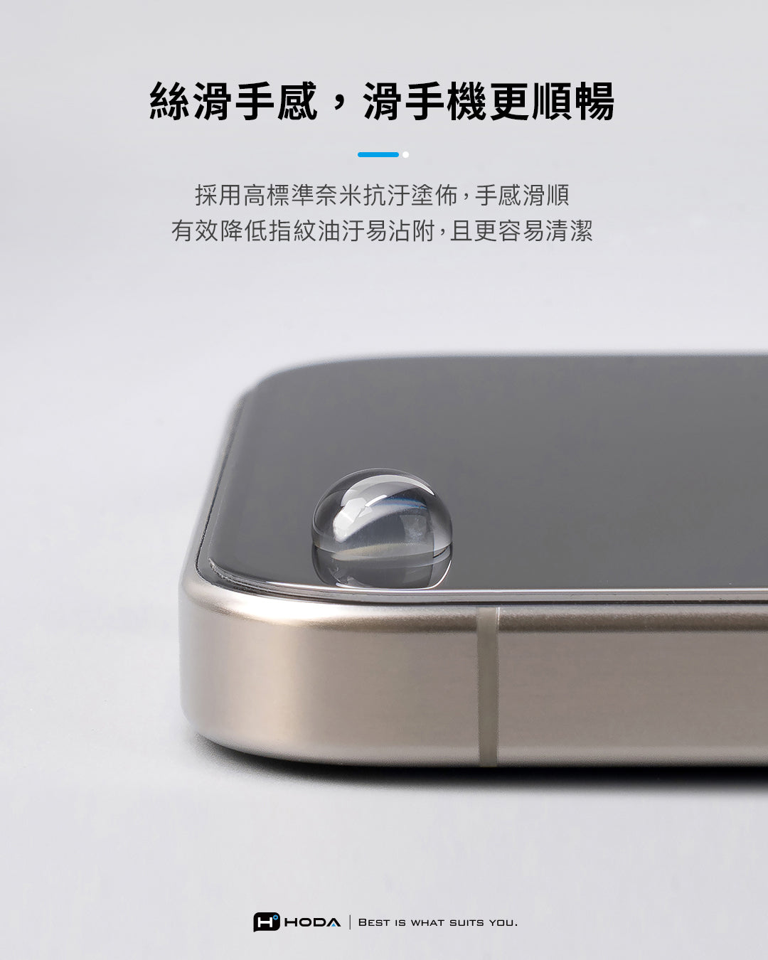✦ 獨家長效抗污配方,初始水滴角高達117°,手感滑順且不易沾附指紋。